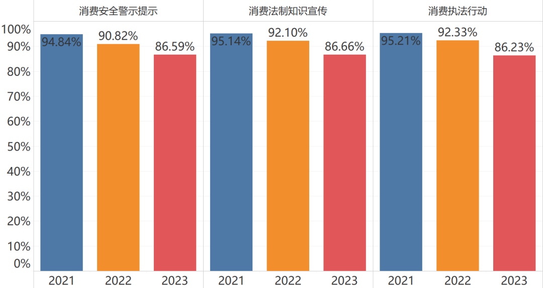 整体来说,2023年消费者对于各个区有关行政部门的保护消费者权益的行动持正面看法,但相比于去年,今年对有关行政部门的消费安全警示提示、消费执法行动以及消费法制知识宣传的评价中,均呈现不同程度的下降,3分以下的评价有所增加。