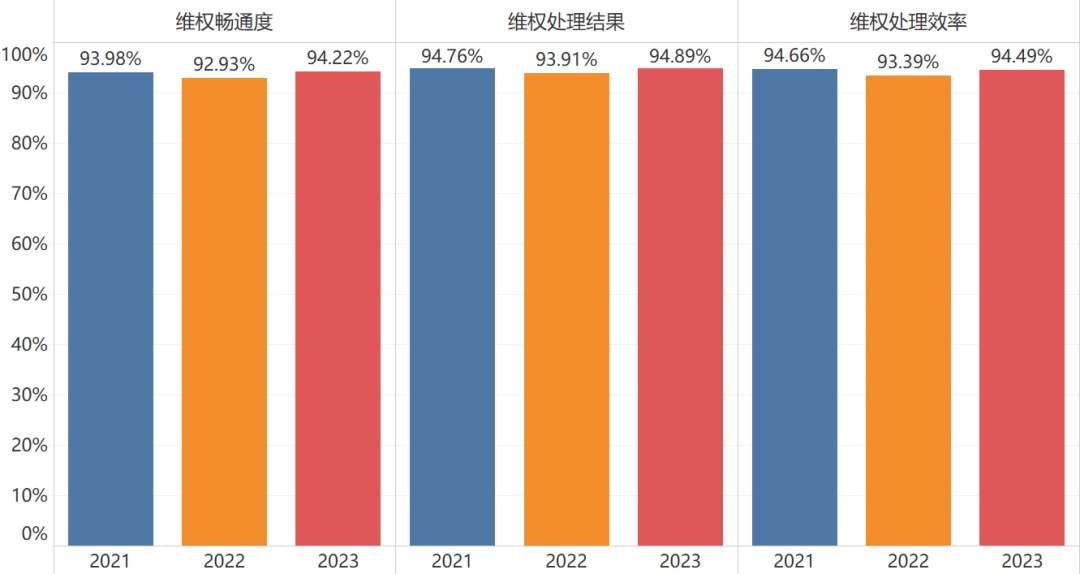 2023年消费维权渠道结构与去年基本一致,大多数消费者都是向有关行政部门或消费者权益保护组织进行维权,今年消费者对于消费维权畅通度、维权处理效率以及维权处理结果的满意度均呈现出不同程度的上升,维权环境较去年相比均有提高。