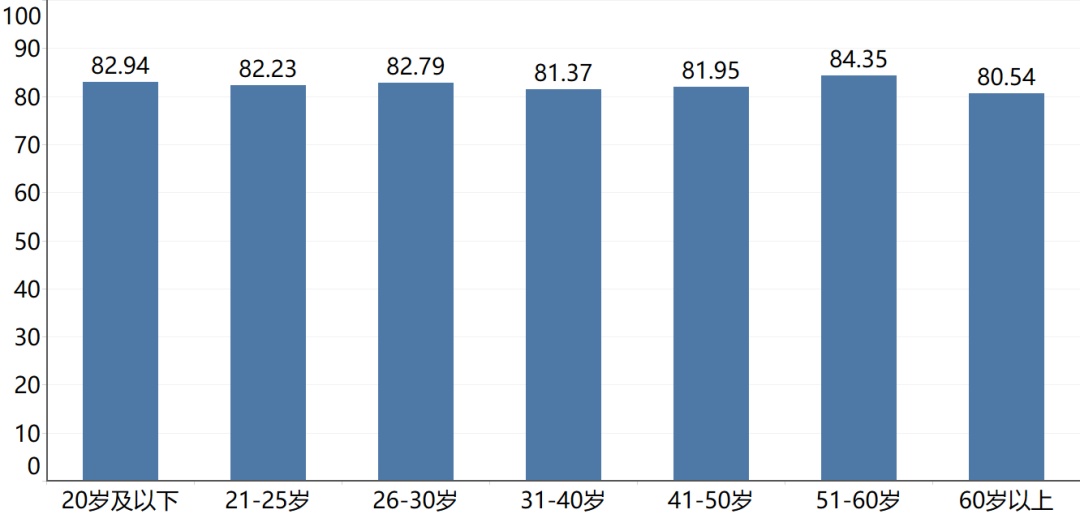 对上海市不同年龄段的消费者满意度得分进行统计。其中,得分最高的前三年龄段分别为:51-60岁84.35分,20岁及以下82.94分,26-30岁82.79分;得分最低的前三年龄段分别为:60岁以上80.54分,31-40岁81.37分,41-50岁81.95分。