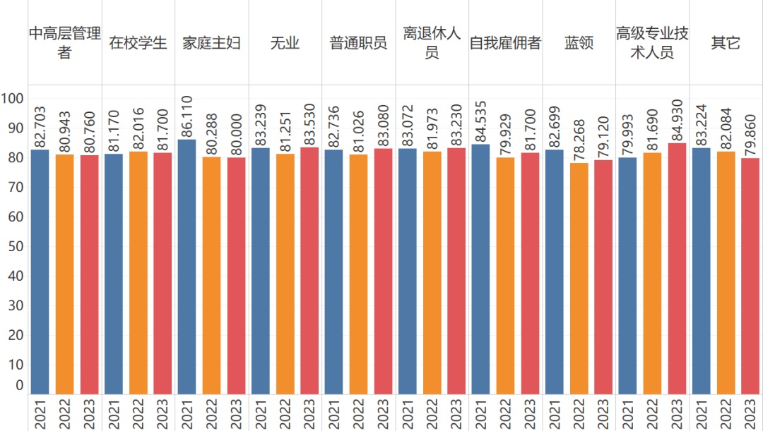 2023年,高级专业技术人员、无业和普通职员进入消费者满意度排名前三位。整体而言,不同职业的消费者群体满意度出现上升,只有中高层管理者群体、在校学生群体、家庭主妇群体和其他群体满意度出现下降情况,分别是80.76、81.70、80.0和79.86。