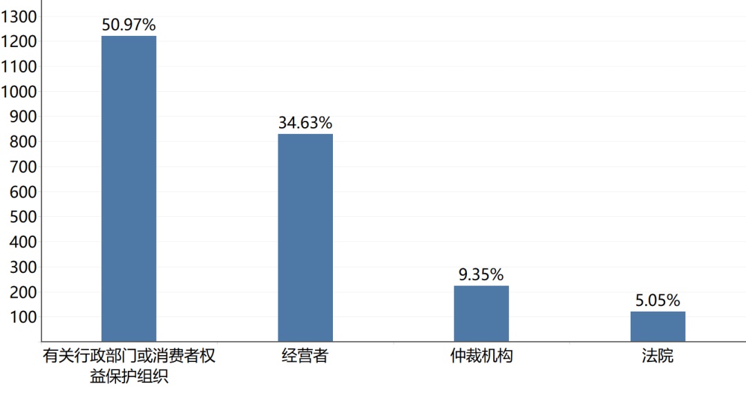 其中,受访者中通过向有关行政部门或消费者权益保护组织进行投诉的方式进行维权的占比最高,为50.97%;其次为向有经营者进行投诉,占比为34.63%;占比最低的渠道是向法院投诉,为5.05%。