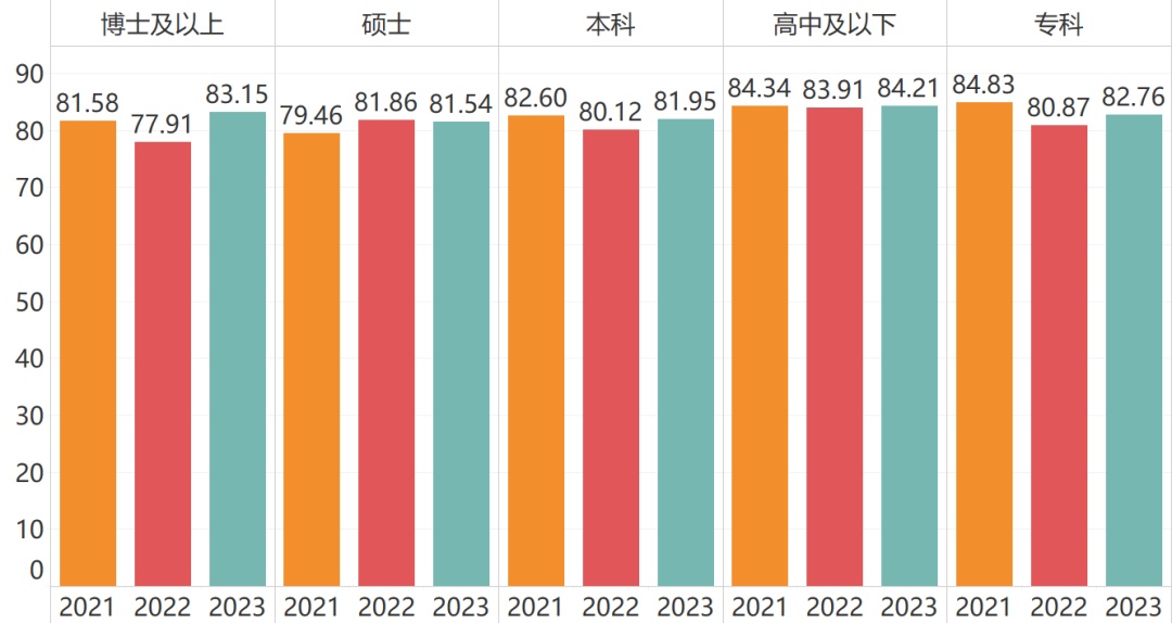 2023年,不同学历的消费者满意度较去年相比出现了不同方向的变化,其中博士及以上学历消费者群体的满意度有明显的上升,硕士学历的消费者群体的满意度与2022年相差不大。虽然不同学历背景的消费者在这三年内的满意度有所波动,但大部分学历段的消费者满意度仍然保持在较高的水平。