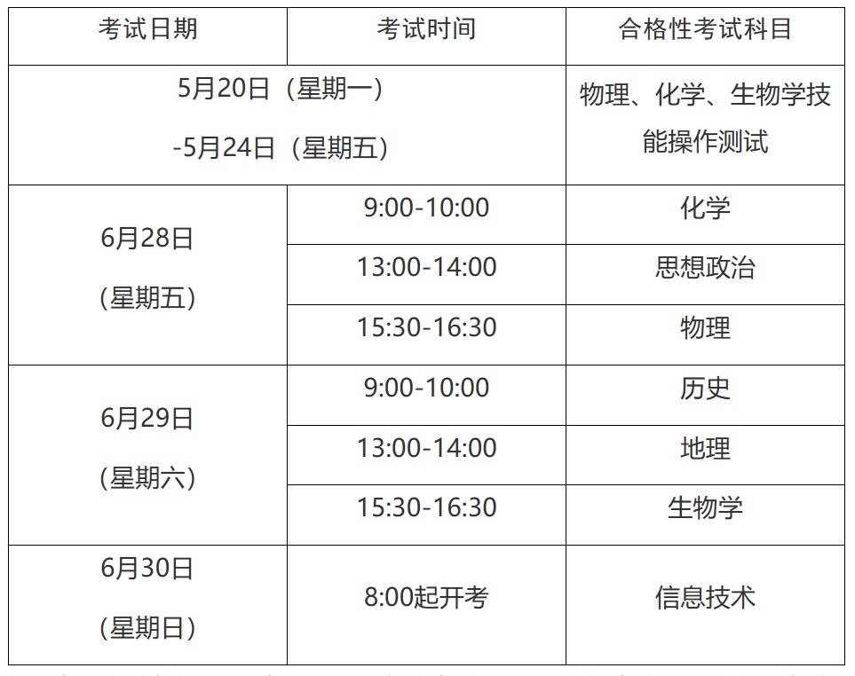 其中,物理、化学、生物学技能操作测试,以及信息技术科目的具体考试时间以准考证为准