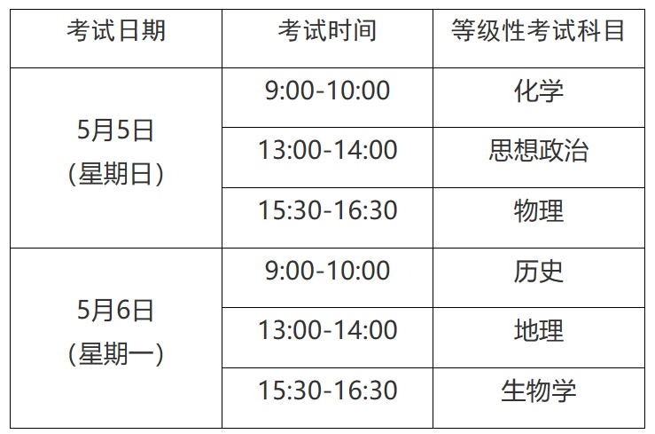 5月等级性考试科目及时间
