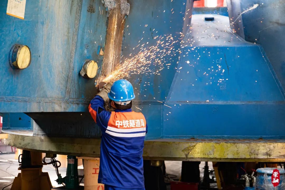 位于崇明庙镇万安村崇太长江隧道3号盾构始发井现场的一处工棚内,“领航号”盾构机的刀盘已经基本完成组装焊接,施工人员正在进行最后的收尾工作。