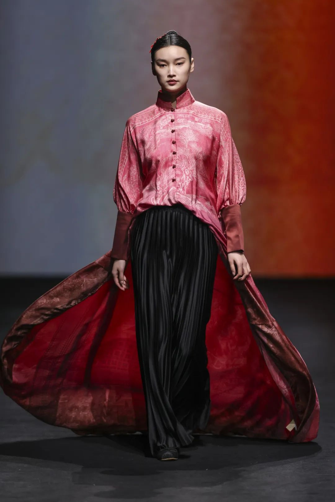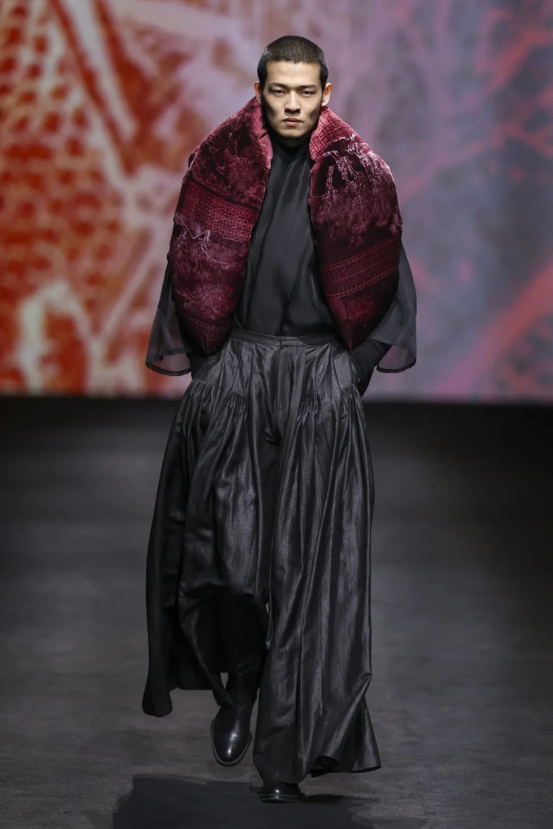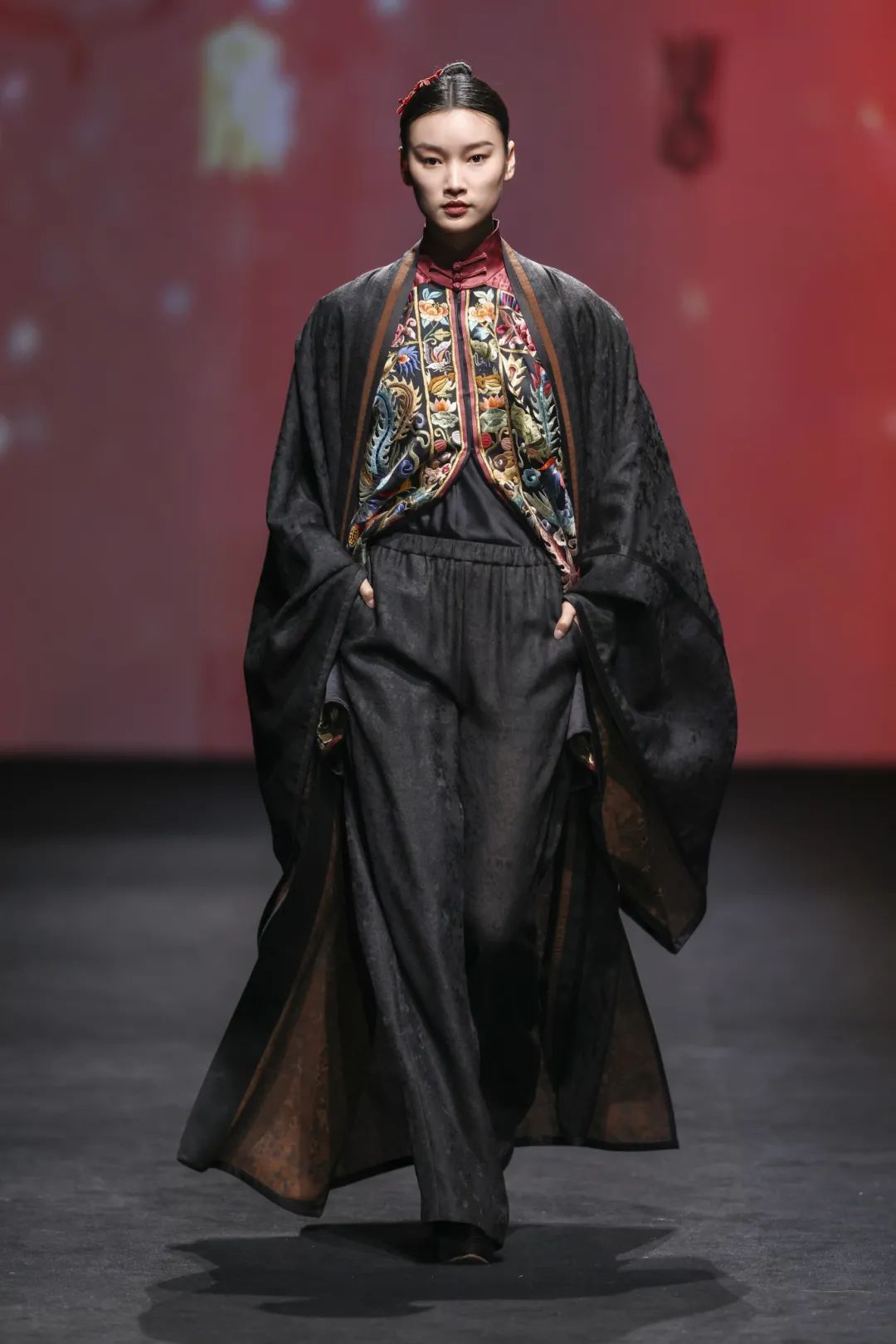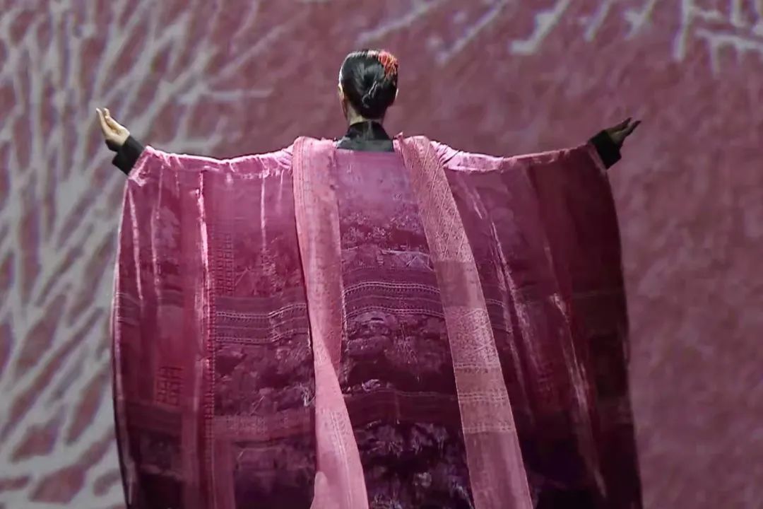 本季荷木hemu“大美之颂”作品从宋代元素中汲取设计灵感,主色系为鞓红色,属传统宋式色彩。宋锦、织锦、莨绸、汴绣、苗绣、扎染、掐丝绒花等极繁的非遗面料和工艺承载于极简的版型结构,在对立统一中表达大道至简的概念,简约里尽显匠心。