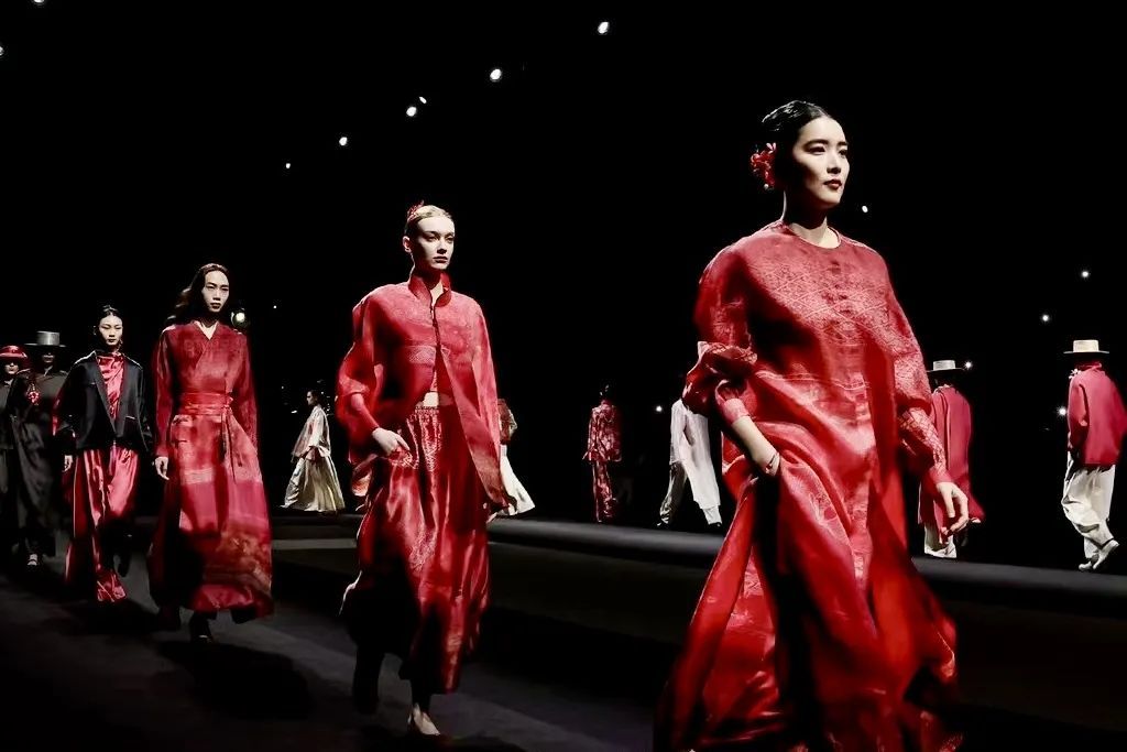 t台中央,长达35米的巨幅画卷《清明上河图》伴着恢宏大气的国风音乐徐徐展开,千年风雅在时尚秀台再次绽放魅力。作为本季主推设计,整幅画作将通过非遗工艺汴绣、莨绸和当代印花设计呈现。