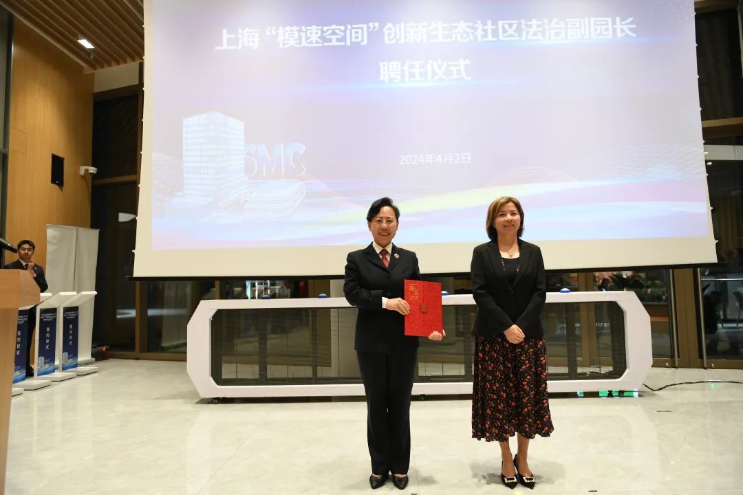 市检察院党组成员、副检察长龚培华,徐汇区检察院党组书记、检察长朱庆华等共同启动“检互·西岸”上海模速空间检察服务平台。朱庆华现场接受了上海“模速空间”创新生态社区法治副园长的聘书。