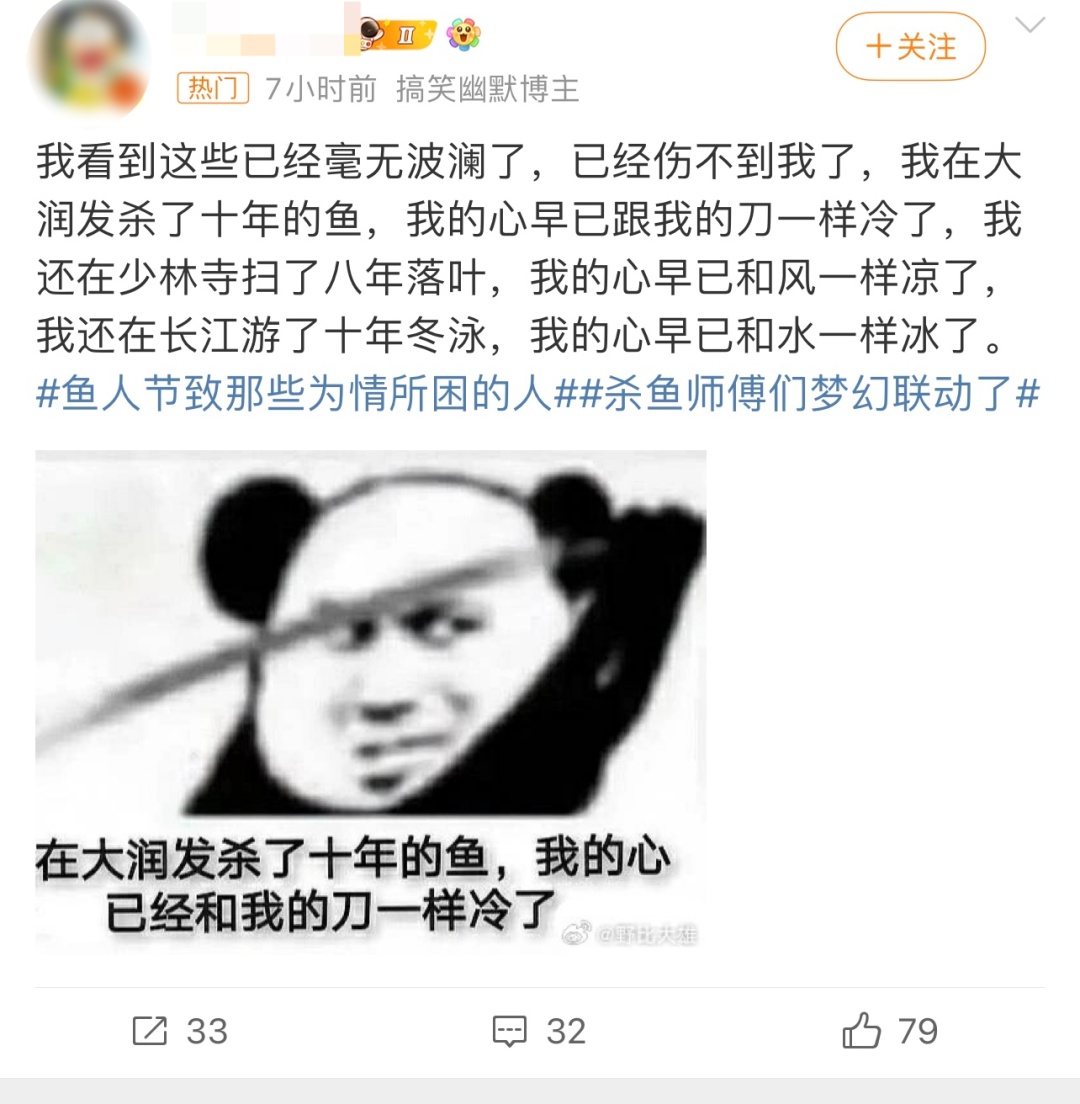 热衷于上网冲浪的人,对这个梗一定不会陌生,这句网络流行语最初起源于一段大润发超市“杀鱼”的视频,常常被网友用来形容自己毫不在意的姿态,类似于英文“who cares”……而近些年,在社交媒体中不乏线上“杀鱼”师傅们的身影。