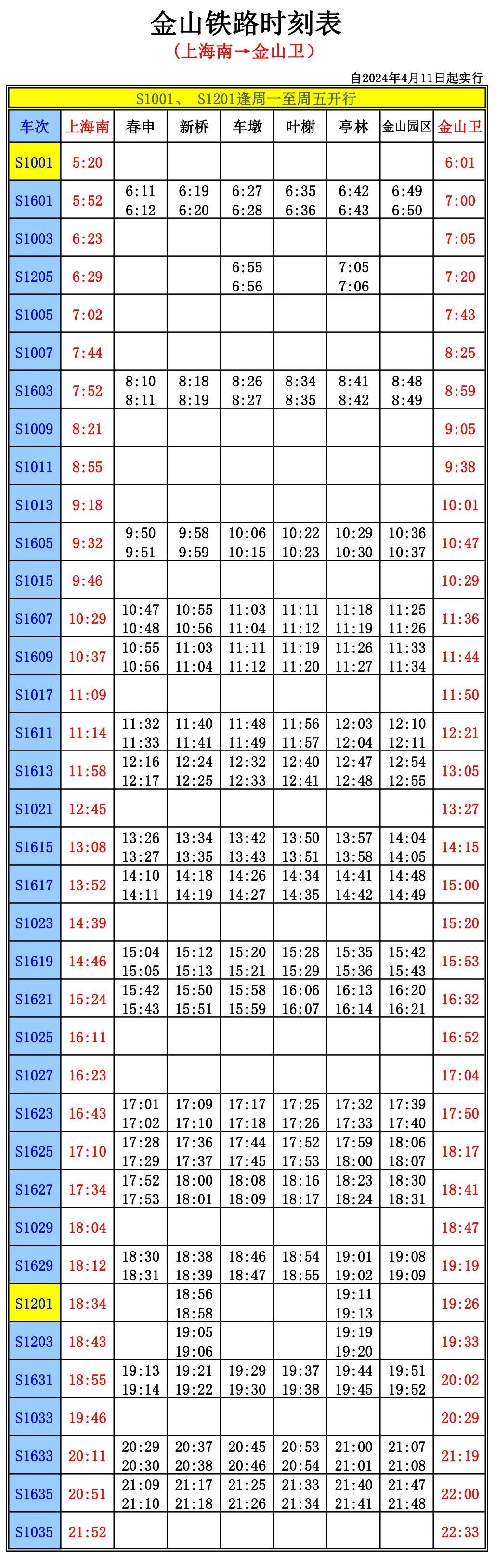 根据最新安排,2024年4月11日起金山铁路对s1003次、s1002次列车时刻进行微调: