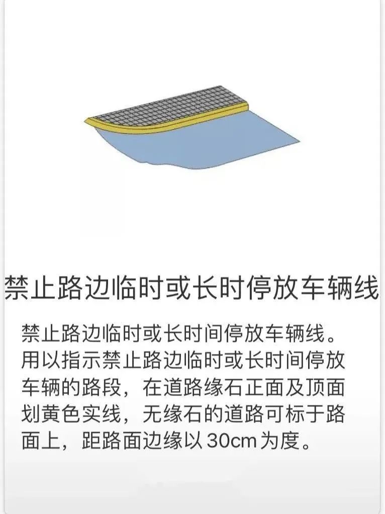 禁停标线:是一条被施划在道路一侧边缘上的单黄实线。出现以下标志则表示该路段禁止一切机动车临时或长时间停放。