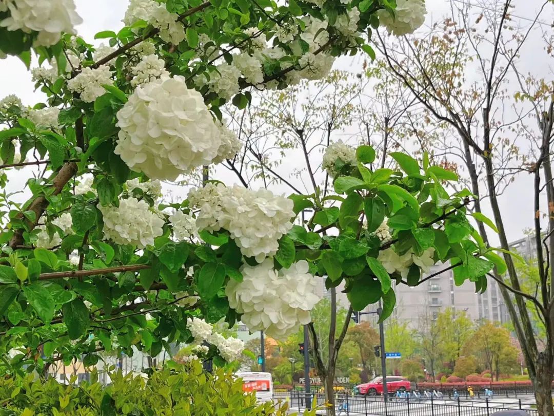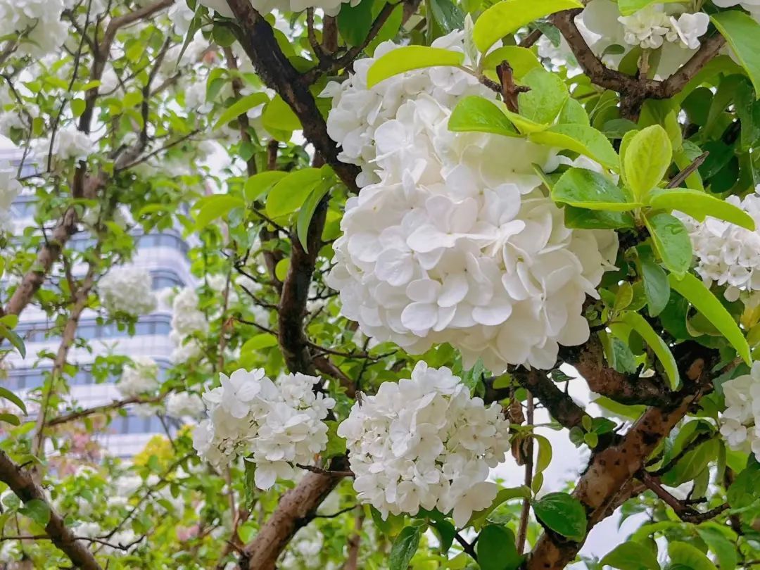 绿意葱葱间,去年春天火爆申城的木绣球正在盛开,洁白的花朵仙气十足。