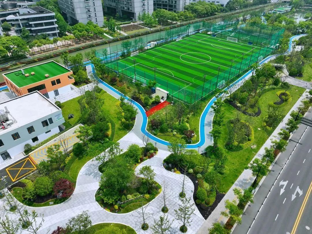 彭越浦西岸绿道连接园内绿道形成为环形,串联园内绿地、景观水系、足球场空间。滨河绿道成为市北高新园区白领和周边居民日常休闲散步的好去处。足球场上更是热火朝天,足球、飞盘、跑步……多样体育健身需求在这里被满足。