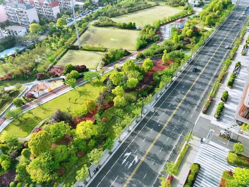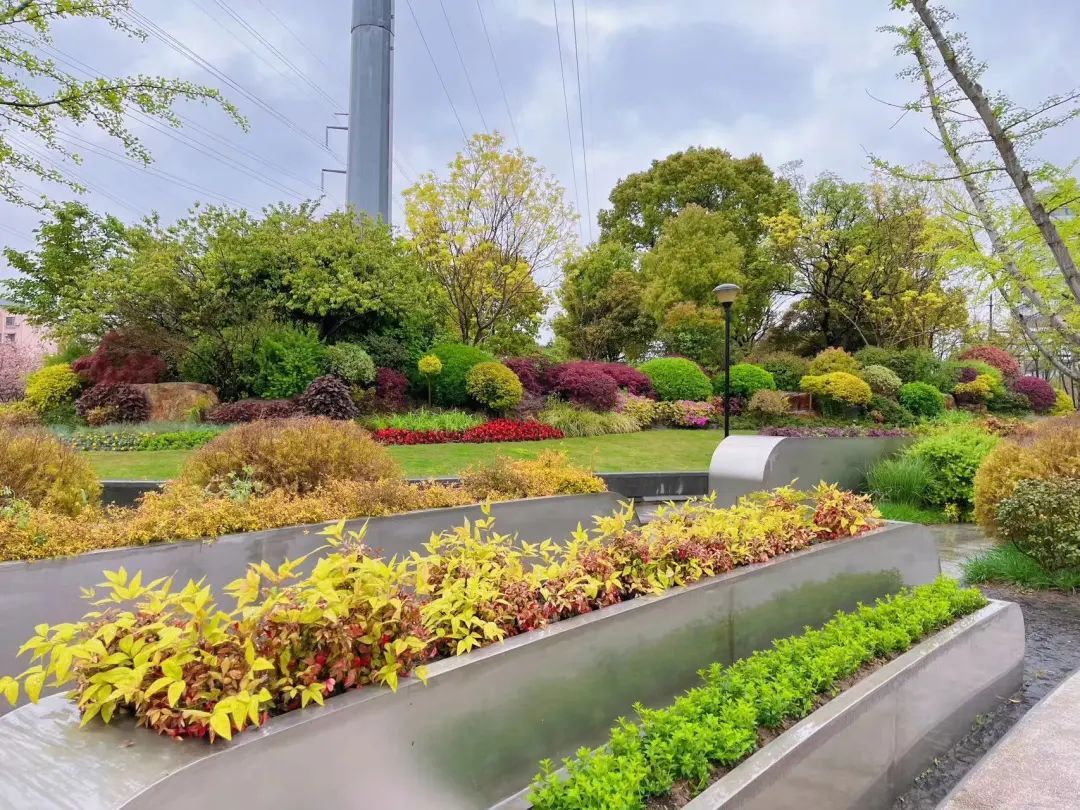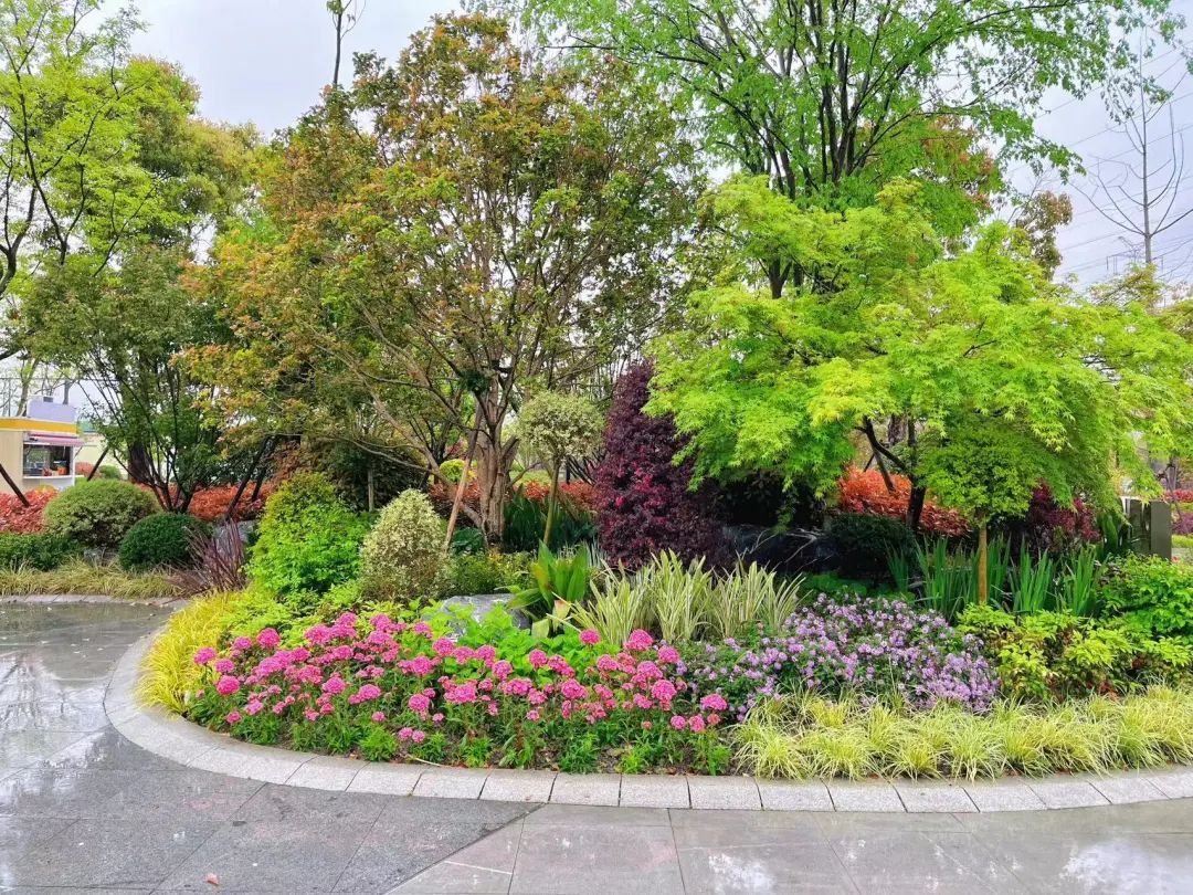 绿地临街一侧,精心搭配过的花境和花坛组合错落有致,相互呼应,成为街头一处亮眼的风景。
