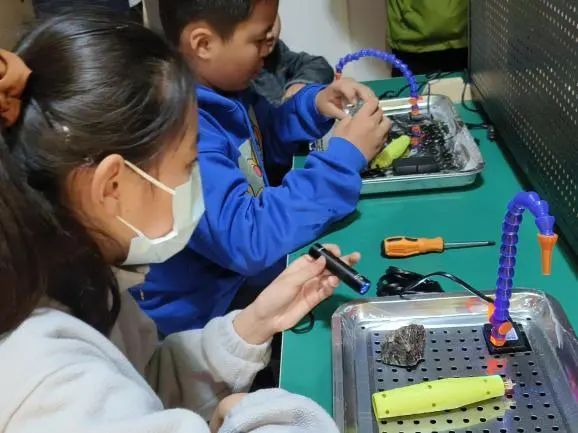 在“地质历奇屋”,孩子们穿上了工作人员提供的“历奇套装”。指导老师利用方钠石在紫光灯下显现火焰光泽的原理,为孩子们呈现了一场科学魔术表演。