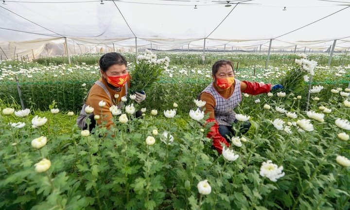 淮安市淮阴区渔沟镇杨庙村,农民在采摘、包装白菊花。