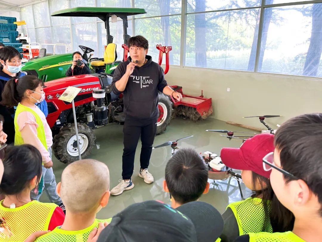 除了插秧体验,“小农人”们还参观学习了农机、农具,包括叉车、剪草机、收割机、农用无人机等农机装备。工作人员还现场讲解并演示了农业机械的使用方法,让孩子们更直观地感受到现代化农业机械高效、智能的作业特点。