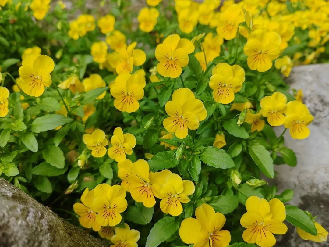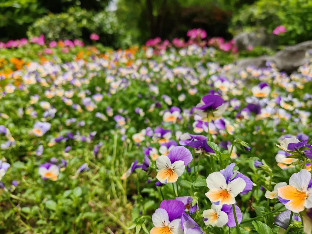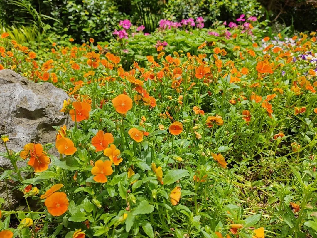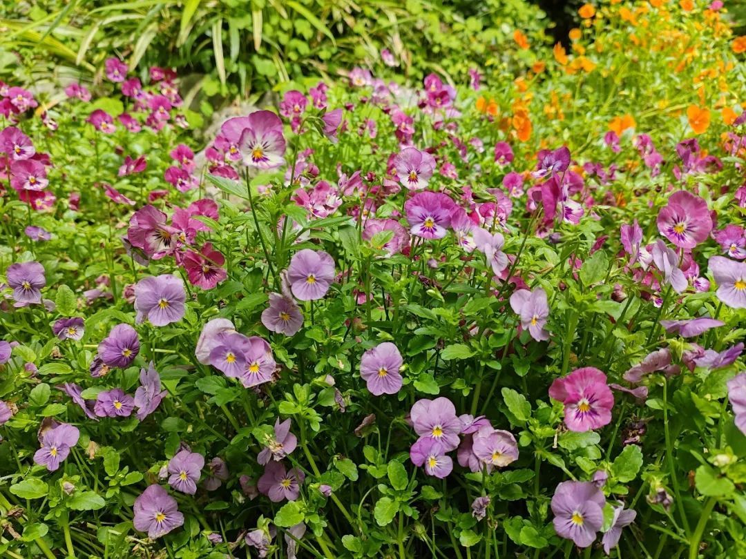 公园南侧的一处小花坛里,种植着许多五颜六色的花朵。紫色、橙色、黄色、白色……别看它们颜色千差万别,可实际上,这都属于同一个品种——角堇。