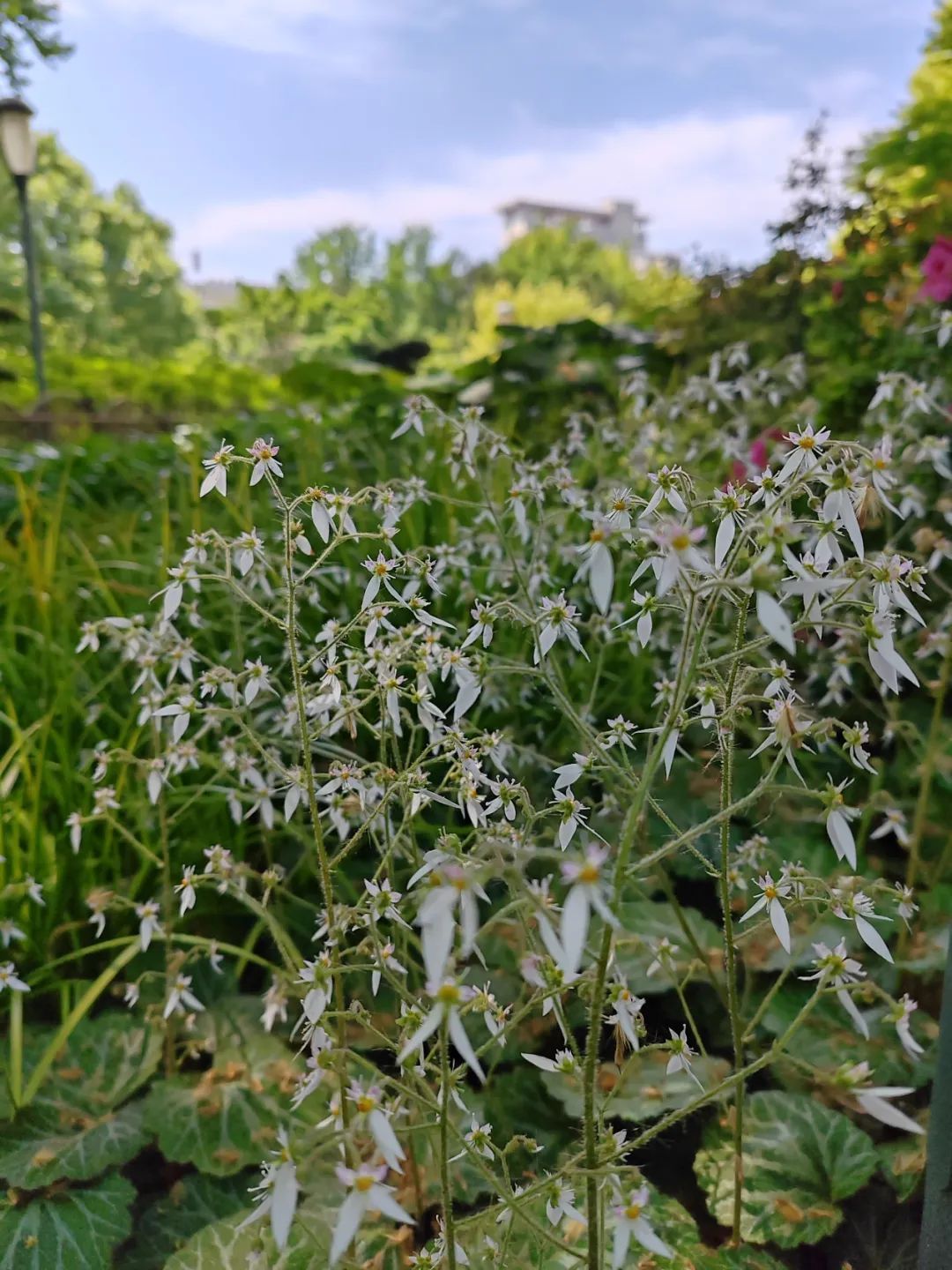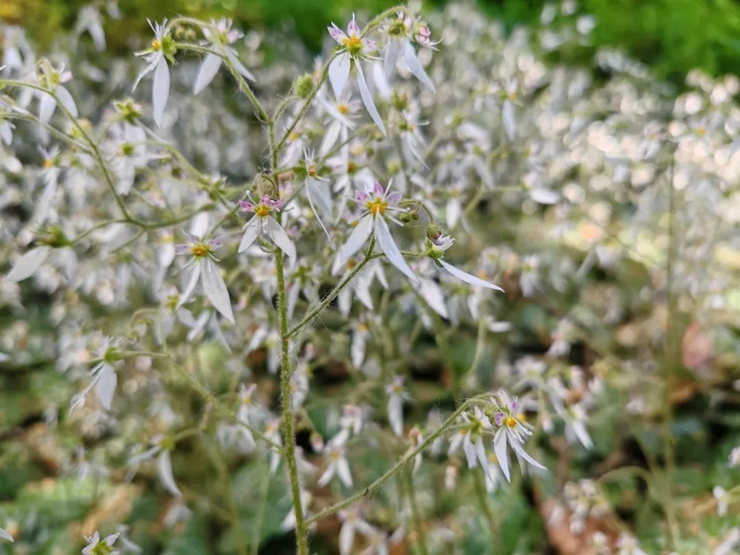 天山公园内还有不少令大家感到“熟悉又陌生”的小花,本土植物虎耳草也是其中之一。走到花坛边,这种乍看只有两片尖花瓣的花朵十分吸睛。近距离观察,中间的两只“触角”也令它形似昆虫。