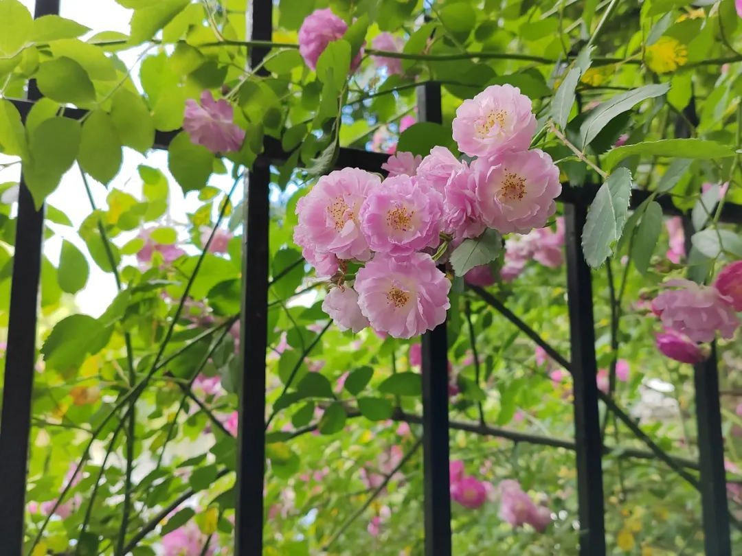 蔷薇均为小花簇生、小叶较多的攀援种类,茎干细长,枝条蔓生或攀援多刺,还有“长春花”的别名。花期仅4—5月一季,不能多季开花。所以,想要赏蔷薇花的市民游客们可要抓紧时间啦!