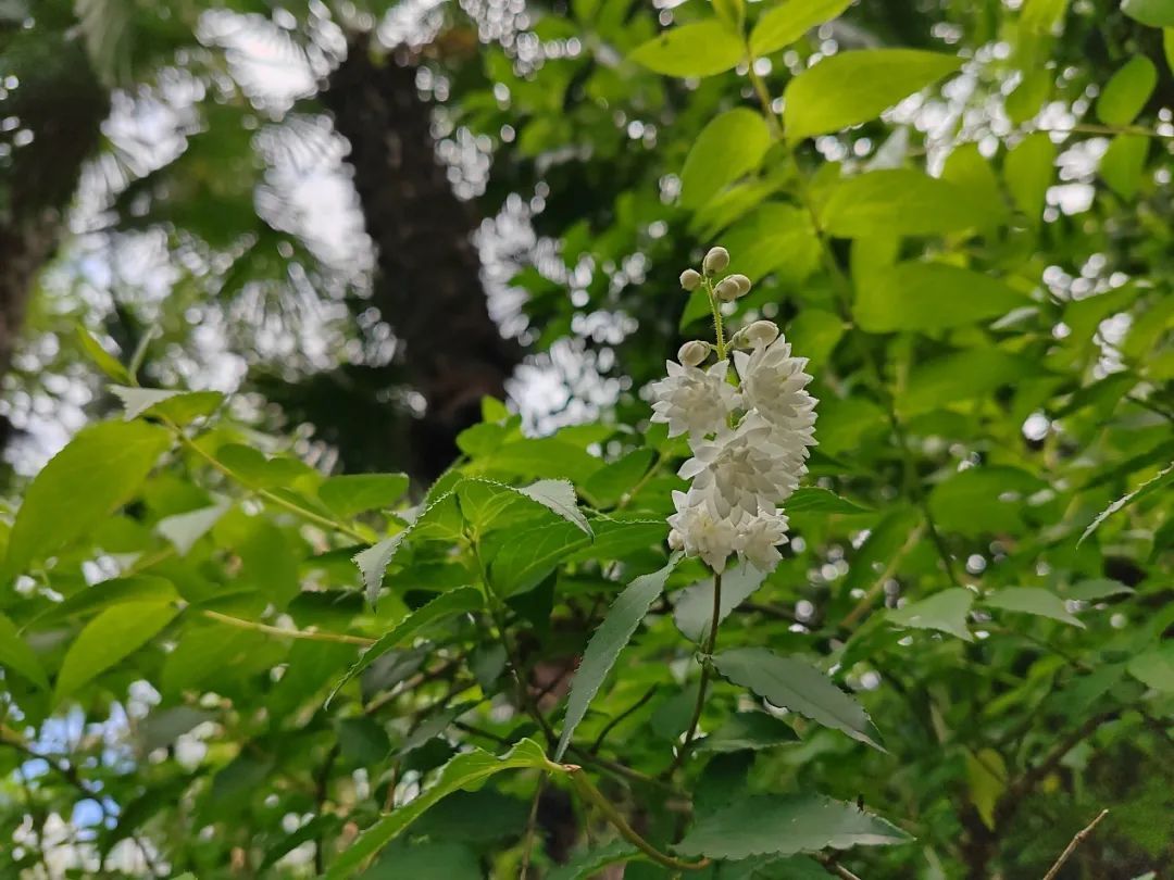 在植物学界,“虎耳草”作为一科,其下还有许多我们熟悉的植物,如绣球、溲疏等。而在天山公园中,溲疏也已经开花,白色重瓣的小花一串串坠在枝头,清丽雅致。