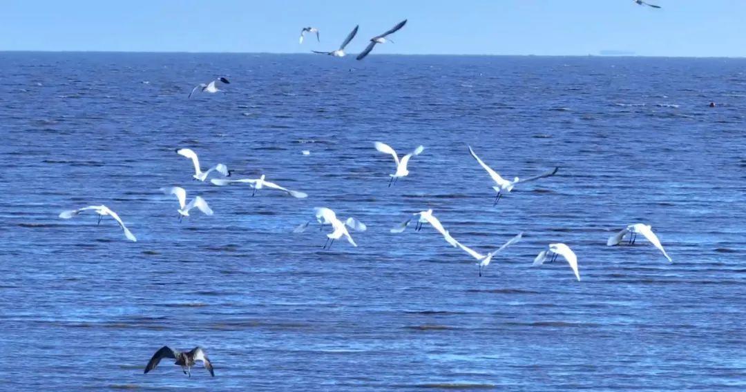 近日,在位于南海新区的威海五垒岛湾国家湿地公园,摄影爱好者拍到了黑脸琵鹭的身影,它们和白琵鹭结伴栖息,与湛蓝大海构成一幅和谐美好的画面。