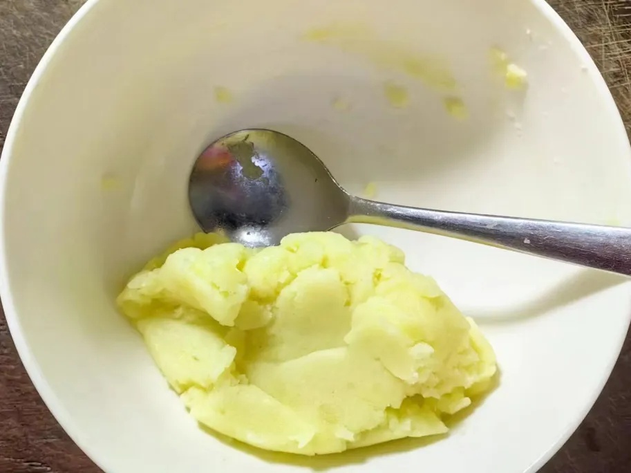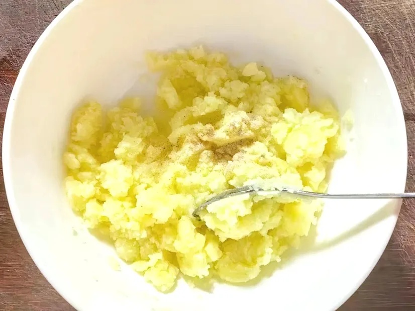 将土豆捣碎成泥,加入适量食用油、盐、白胡椒进行调味。