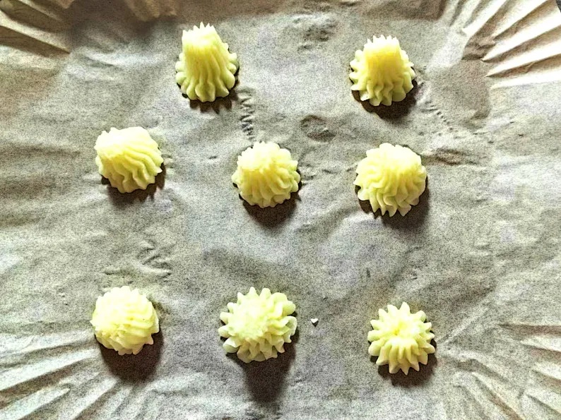 纸托表面刷一层油,将土豆泥挤出,放入空气炸锅,200℃烤制10分钟。