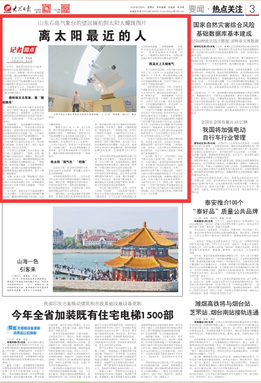 5月9日,大众日报要闻版以《离太阳最近的人》为题,对山东石岛气象台的太阳观测业务进行了报道。