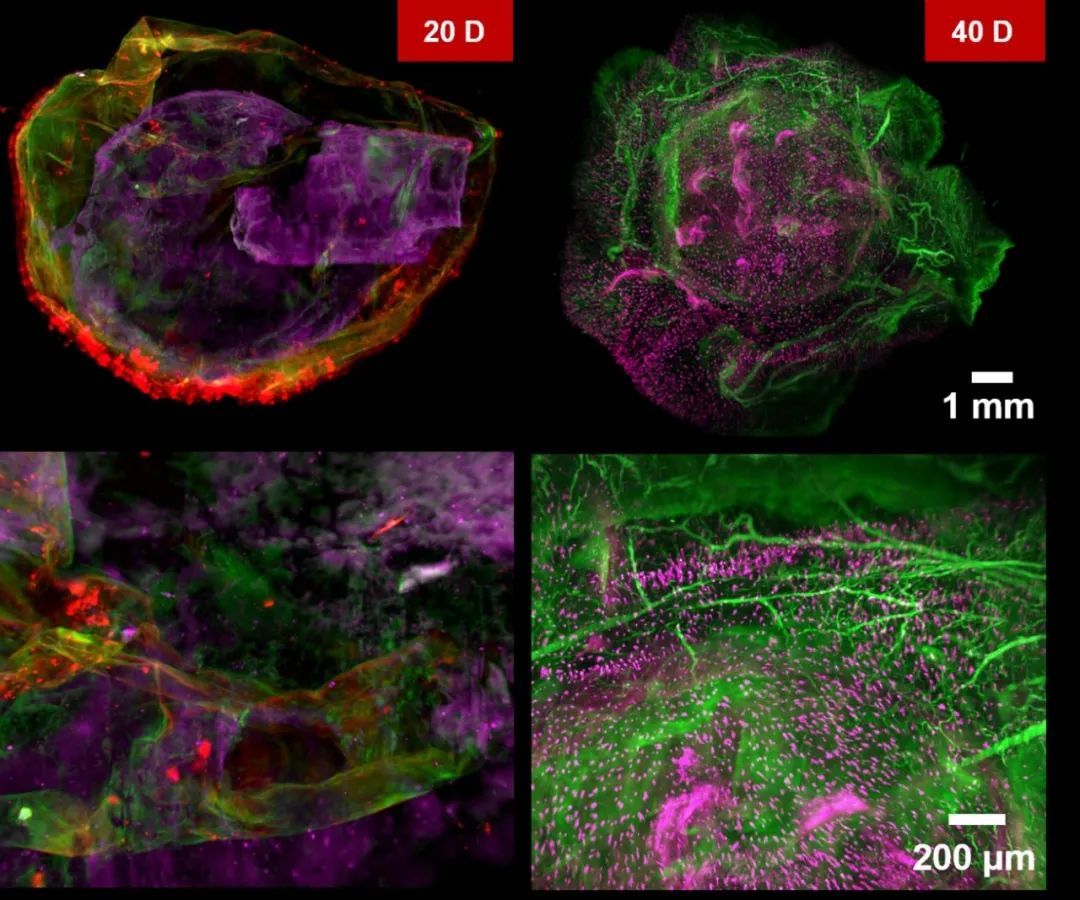 骨类器官血管化(红色标记ⅱ型胶原,紫色标记骨膜蛋白,绿色标记血管标志物cd31)