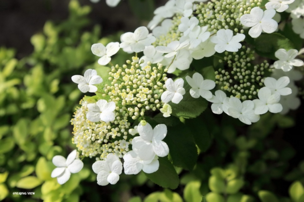 出众的气质让琼花在万紫千红中独树一帜,虽然洁白如天山之雪,却没有那份高不可攀的冷意,春日的阳光下,白色五角花瓣笼上一层柔和的光晕,隐约透出一抹暖色。