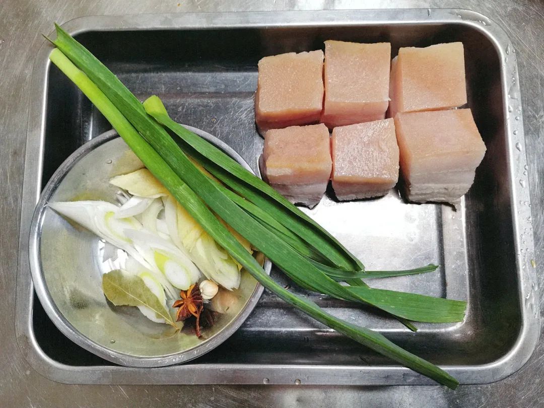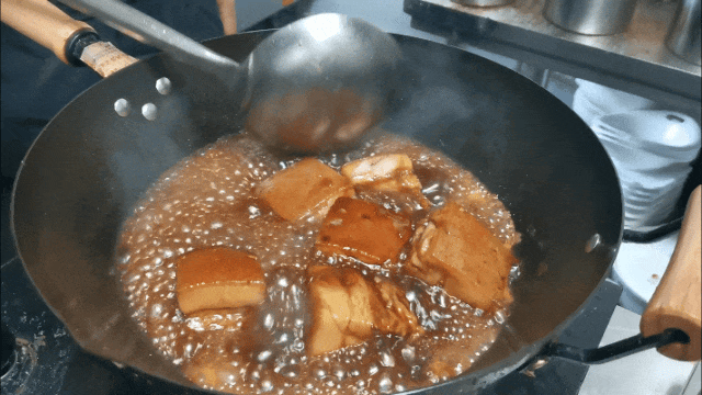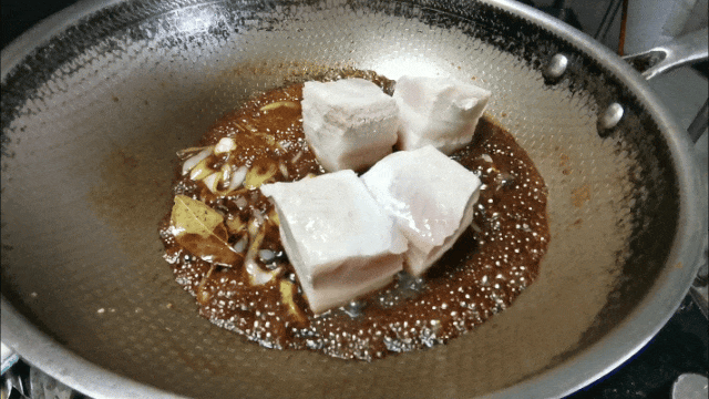 先在锅中倒油烧热后将大葱、姜、香料等放入油中爆香,再倒入生抽、冰糖、花雕酒一起翻炒,将猪五花皮朝下放入锅中煮,加入老抽,并倒入肉汤浸没肉块,大火烧开后小火焖120分钟,期间将汤汁慢慢浇到肉上使其更入味,肉在微微抖动时可出锅。