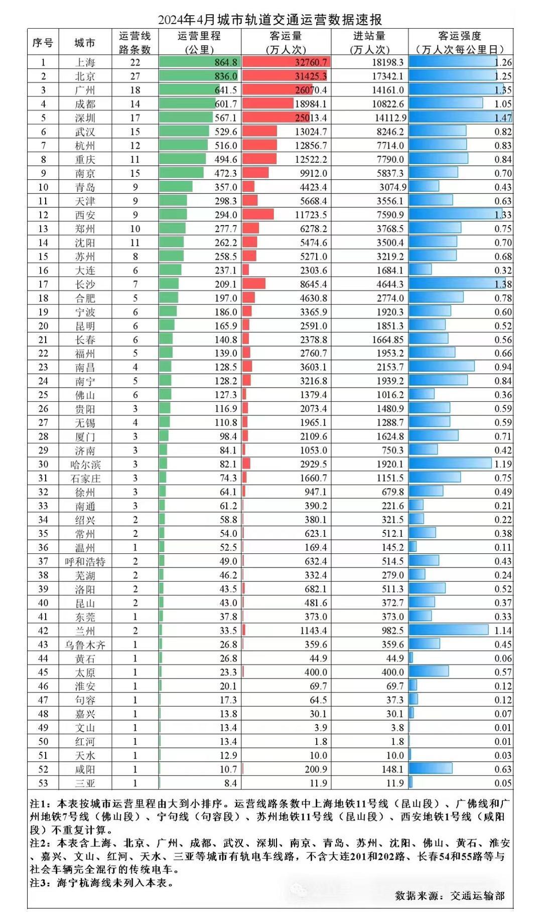 5月10日,交通运输部数据显示,2024年4月,31个省(自治区、直辖市)和新疆生产建设兵团共有54个城市开通运营城市轨道交通线路310条,运营里程10273.7公里,完成客运量27.6亿人次。其中,4月份济南地铁完成旅客运送量1053万人次,同比增长21.82%,环比增长3.54%,超过3月份的1017万人次,连续两月创下新高。
