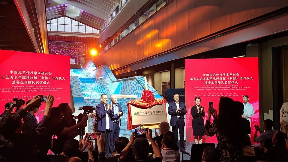 在山东工艺美术学院博物馆新馆开馆仪式上,山东工艺美术学院党委书记王晓娟在欢迎词中表达了对潘鲁生教授无私捐赠民艺藏品的高尚情怀表示敬意和感谢。她指出,博物馆建设凝聚着捐献者、建设者以及方方面面的心血、汗水和智慧,是大学文化建设的宝贵精神财富。博物馆新馆开馆使用,不仅是山东工艺美院的盛事,也是中国工艺美术界的盛事。学校将充分依托博物馆群丰富的传统文化资源,统筹推进文物保护利用传承,加强民艺的挖掘阐释传播,推动现代艺术设计教育创新发展。