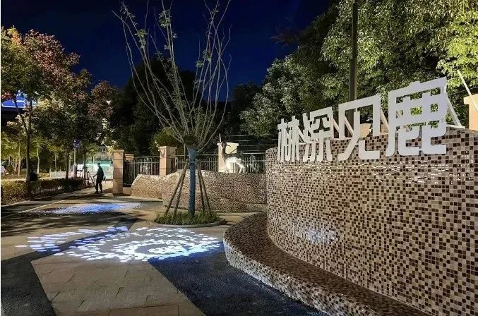 在民乐城惠益新苑北苑出入口处,惠南镇以“林深见鹿”为主题打造了一处“壶中天地”。在这里,有蜿蜒曲折的坐凳,有马赛克装饰的景墙,花坛里种植层次丰富的绿化,以及以“鹿”主题的景观小品,寓意深林中寻麋鹿。