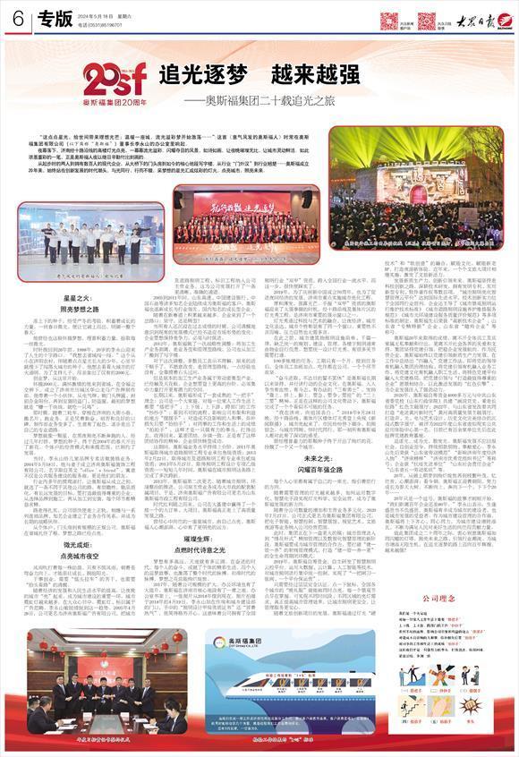 值此集团成立二十周年之际,衷心祝愿奥斯福如同闪耀的灯塔,照亮未来之路、引领行业潮流、为城市增添无限生机,在追光逐梦的路上迈向百年辉煌,越来越强!
