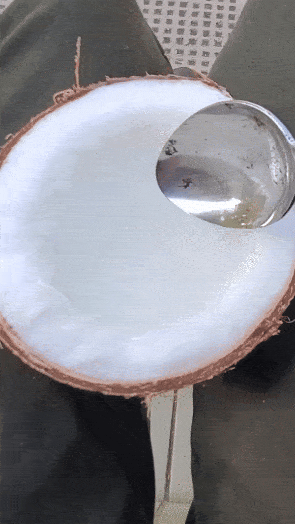 椰子打开后不是你所熟知流动性较高的椰汁,而是有弹性的胶状物,但又有点糯糯的,看起来口感很棒。