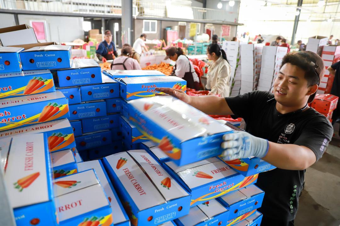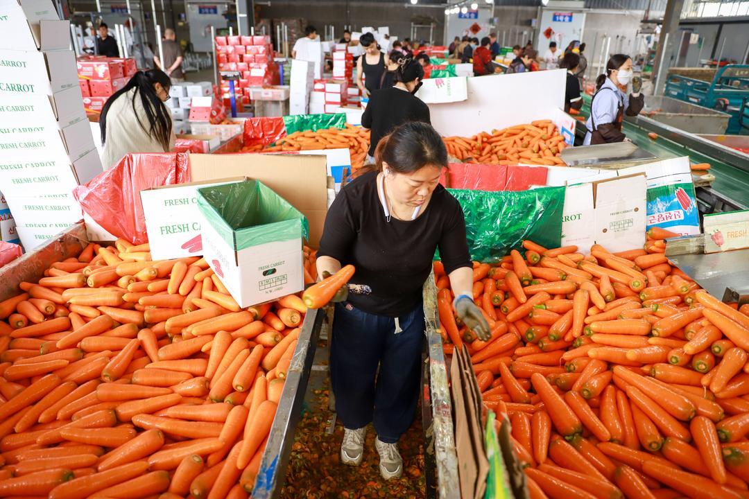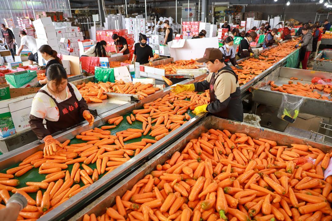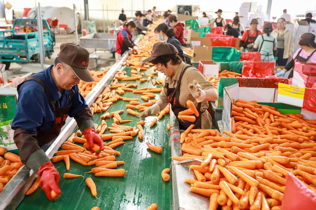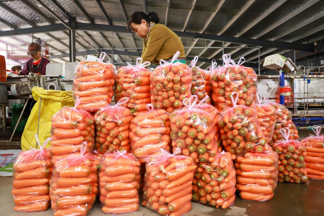 在店埠镇的一家农业合作社内,工人们正忙着为胡萝卜去缨、清洗、装箱。店埠胡萝卜外形美观,色泽鲜艳,口感甜脆,营养丰富,有红皮、红肉、红芯“三红”美誉。