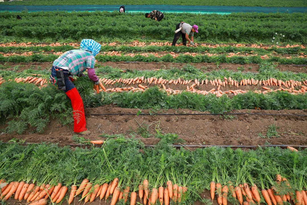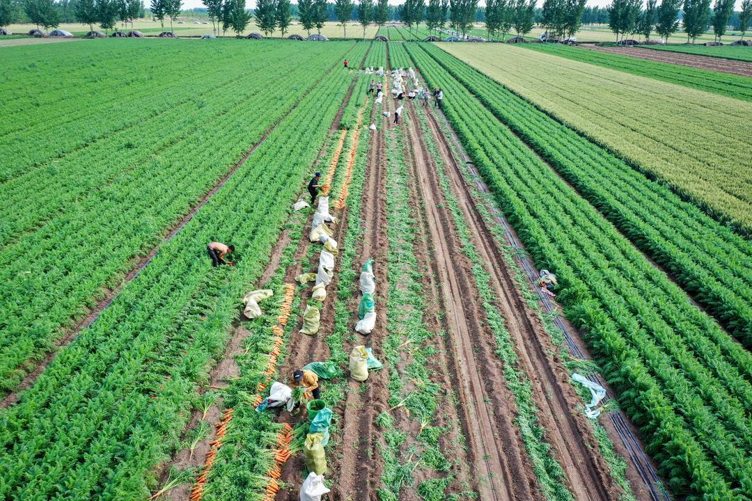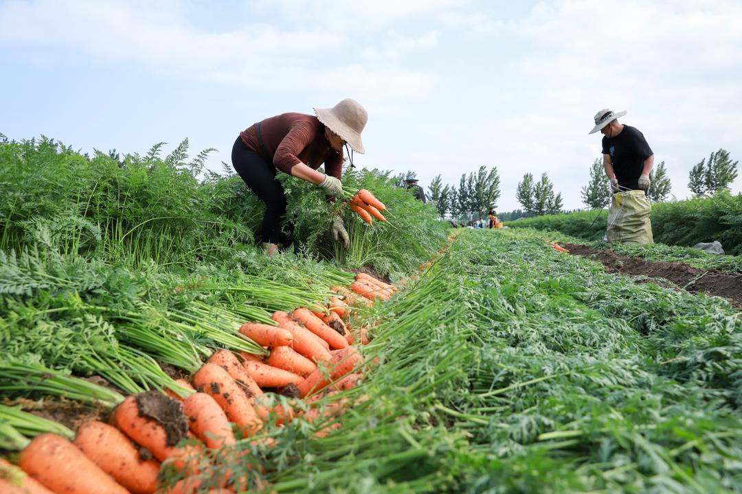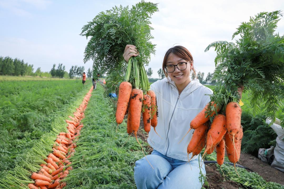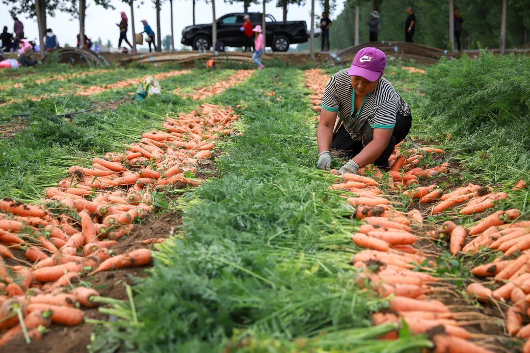 5月21日,青岛莱西市店埠镇李仙庄村的农田里,上千亩胡萝卜正在收获。店埠镇胡萝卜种植历史悠久,是山东省最大的胡萝卜加工基地和春季胡萝卜主产区,素有“沽水菜乡、萝卜小镇”的美誉。