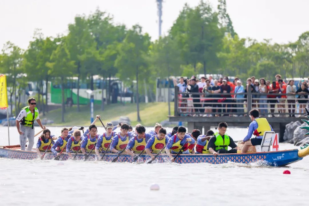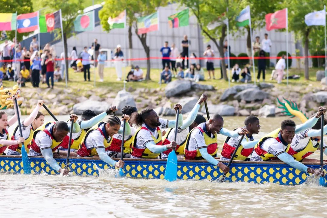 随着一声令下,龙舟如离弦之箭,水面上留下一道道波痕,现场气氛瞬间点燃。“轻凫飞燕各如云,飞桨逐浪竞风流”,划手们个个斗志昂扬,挥浆疾驰,岸边的观众不时为龙舟队员们呐喊助威,现场人声鼎沸、热闹非凡,不同的肤色、相同的笑颜,绘成了一幅文化交融沟通的精彩画卷。