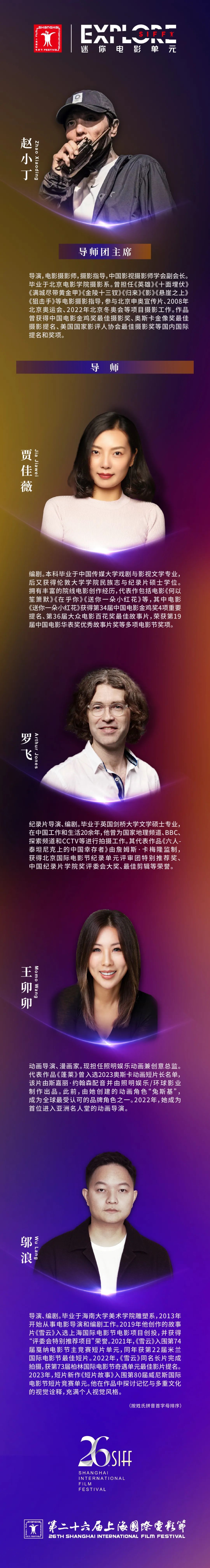 通往siff的梦想之路还在延续,本届迷你电影单元20部入选作品到底花落谁家更是值得期待。目前,由知名摄影师、摄影指导赵小丁,英国编剧、导演罗飞,青年导演邬浪,动画导演王卯卯,编剧贾佳薇组成的导师团已经开启了“50进20”的评审工作,并提名各自心中的单项荣誉作品。他们将秉持鼓励原创的核心理念,围绕影像叙事、视听语言、艺术美学、制作技术等多重维度,对作品的完成度和创新力进行综合评估,既鼓励创新探索,也预见未来成长空间。