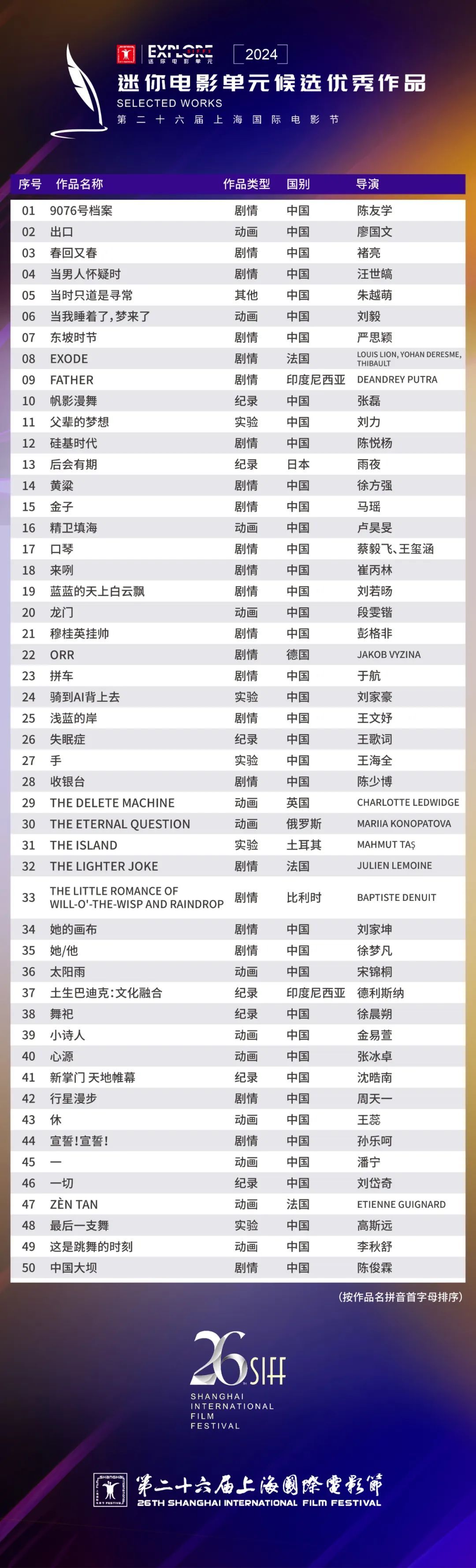 第二十六届上海国际电影节迷你电影单元今日公布50部候选优秀作品名单,作品涵盖多元类型,包括剧情类作品24部,动画类作品13部,纪录以及实验等其他类型作品13部。