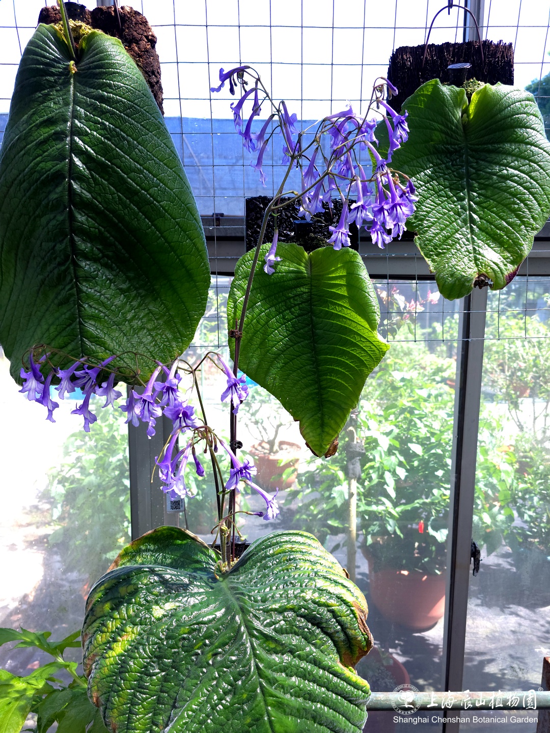 近日,来辰山植物园参观的游客,在热带花果馆(温室a馆)食虫馆入口处,都被一捧蓝紫色花朵吸引到,仔细一看,一片硕大的叶子“慵懒”地铺散在花台边上,长达50公分左右,在叶子的基部,陆续抽出5根由高到低依次排列的花序,最高的花序已然进入盛花期,最低的才刚长出花苞。这个神奇植物就是苦苣苔科的单叶海角苣苔。这株单叶海角苣苔是辰山植物园引种保育并于2022年成功播种后的首次开花,最佳观赏期将持续至6月下旬。