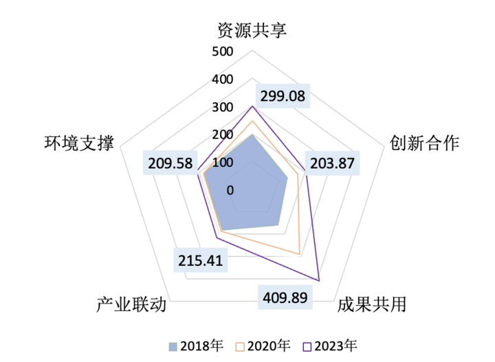 从一级指标发展变化看,近年来,长三角区域资源共享、创新合作、成果共用、产业联动、环境支撑五个方面都取得了卓越成效。五项一级指标中,成果共用指标增幅最大,从2018年的159.24分提高到2023年的409.89分,年均增速达到20.82%。资源共享指标次之,从2018年的197.51分增长到2023年的299.08分,年均增速达到8.65%。增速第三的是产业联动指标,从2018年的182.70分增长到2023年的215.41分,年均增速达到3.35%。