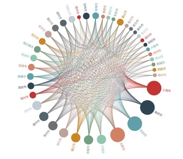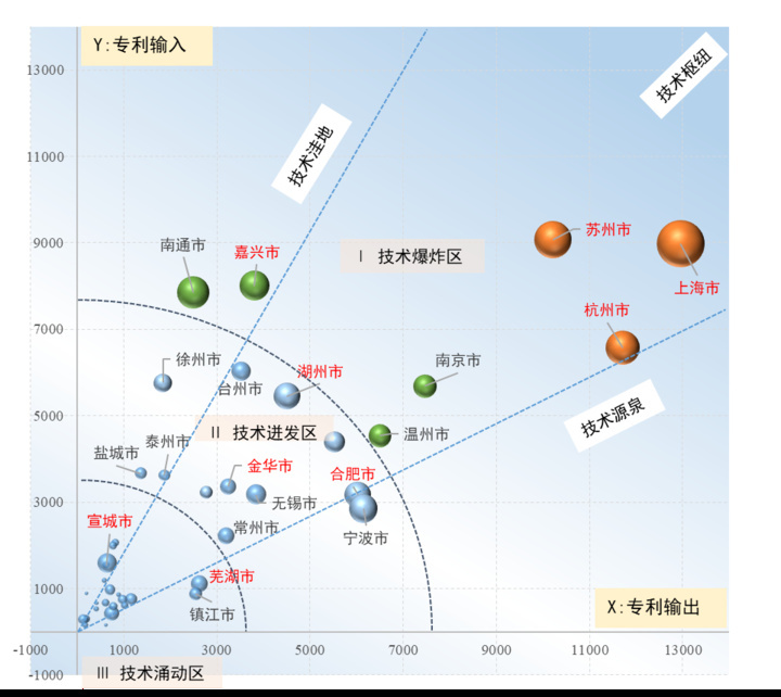 (注释:横坐标为专利输出量、纵坐标为专利输入量,球形面积大小代表了城市内部专利转移数量规模,红标为g60科创走廊城市)