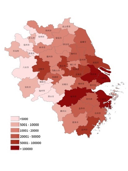 从江苏城市表现看,苏州、南京是长三角较为典型的技术枢纽型城市,技术转移十分活跃,近五年专利转移(含输出和输入)总量分别达1.9万件、1.3万件,处于技术爆炸区;无锡、常州同样属于技术枢纽型城市,专利转移总量均达0.5万件以上,处于技术迸发区。