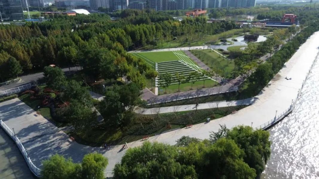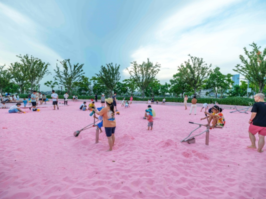 从台阶草坪沿黄浦江往南走去,300米左右就是西式风格的前滩月季园,月季园中花团锦簇,藤本月季爬满了拱形廊架,非常适合打卡出片。再往南500米,即是前滩遛娃圣地——“网红”粉色沙滩,看小朋友们忙忙碌碌地挖沙子、堆沙堡,非常治愈。