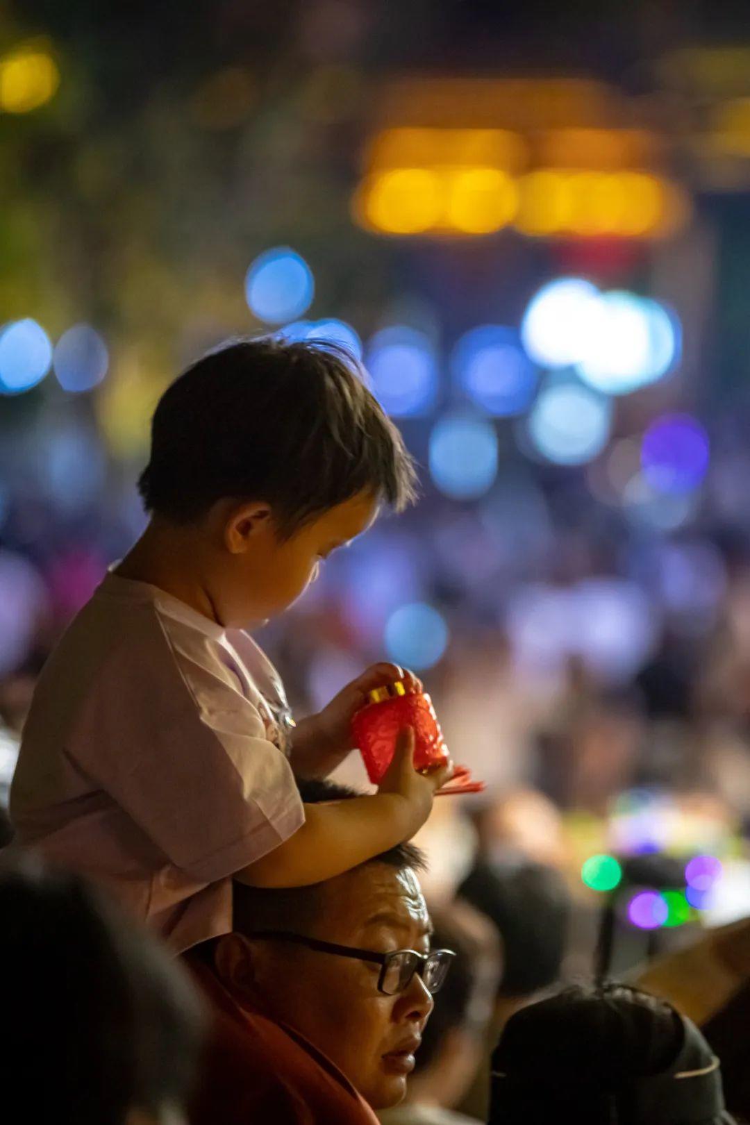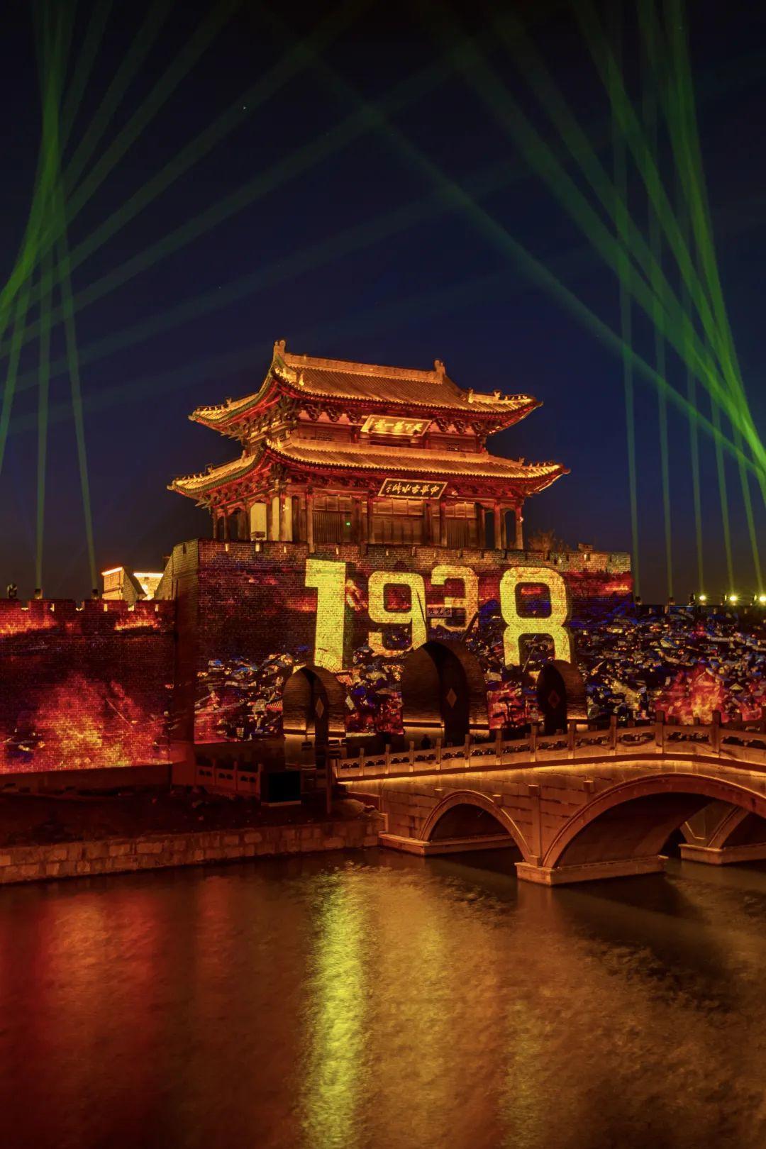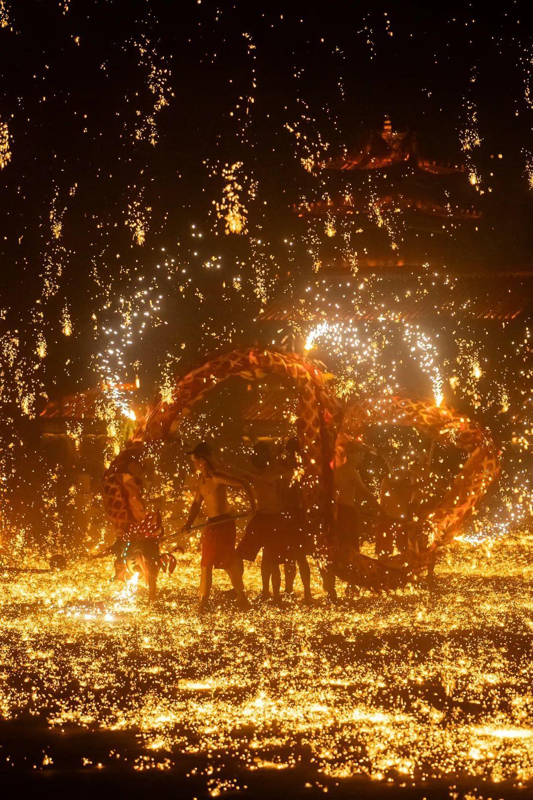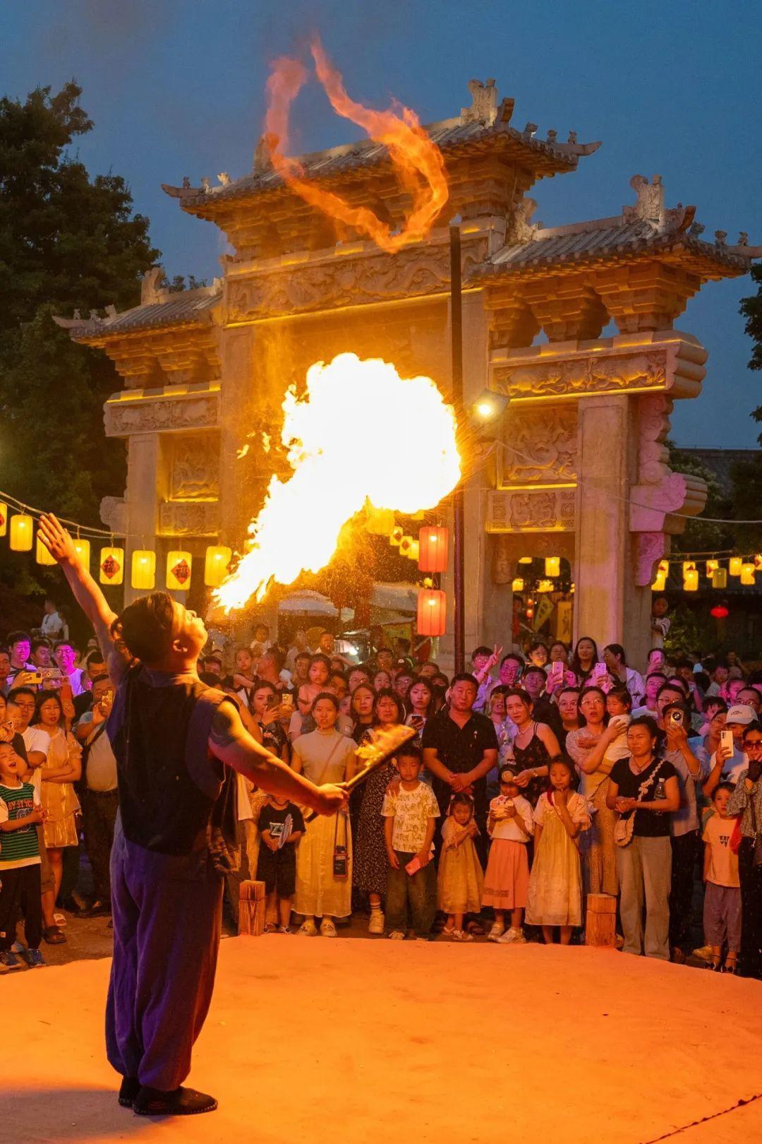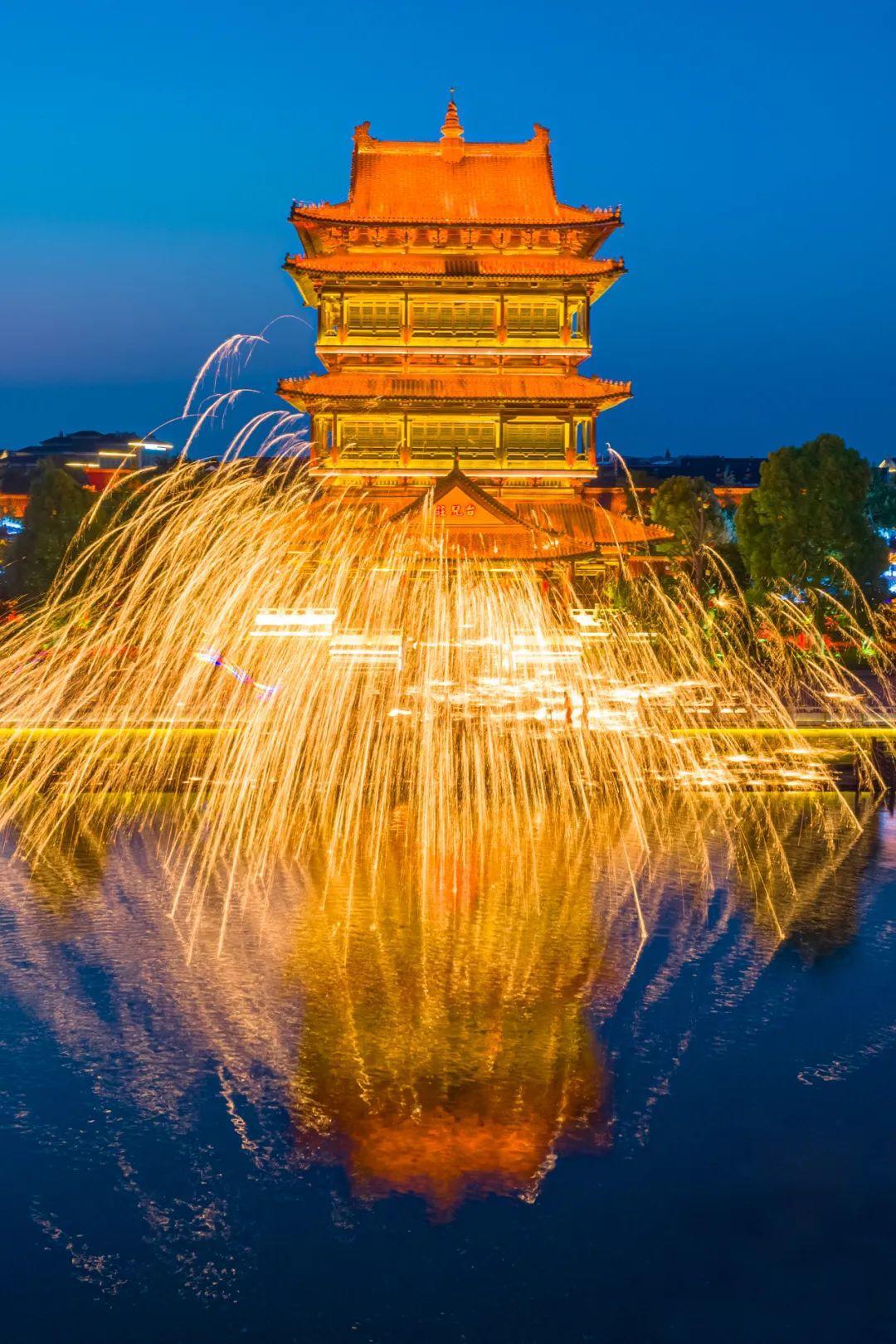夜晚的台儿庄古城,非遗演艺精彩纷呈,铁花绽放绚丽星空,科技与传统的结合更加震撼人心,游客纷纷驻足欣赏并拍照打卡。