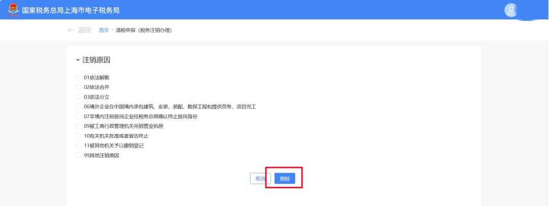 选择注销原因并进行预检
