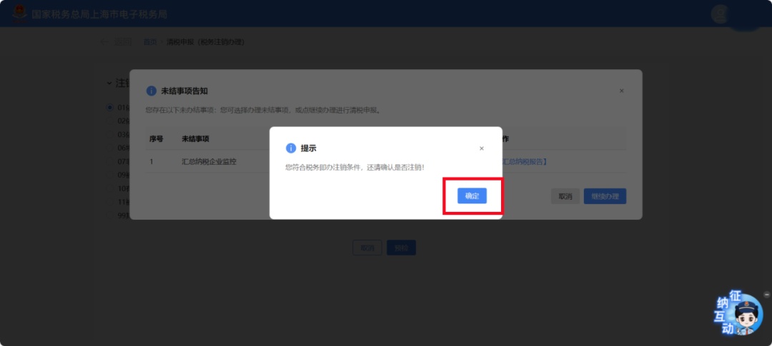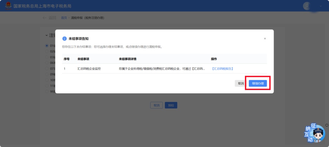 如企业存在未办结事项,系统将提示 “未结事项告知”,可根据具体情况选择是否需要结清,点击【继续办理】。